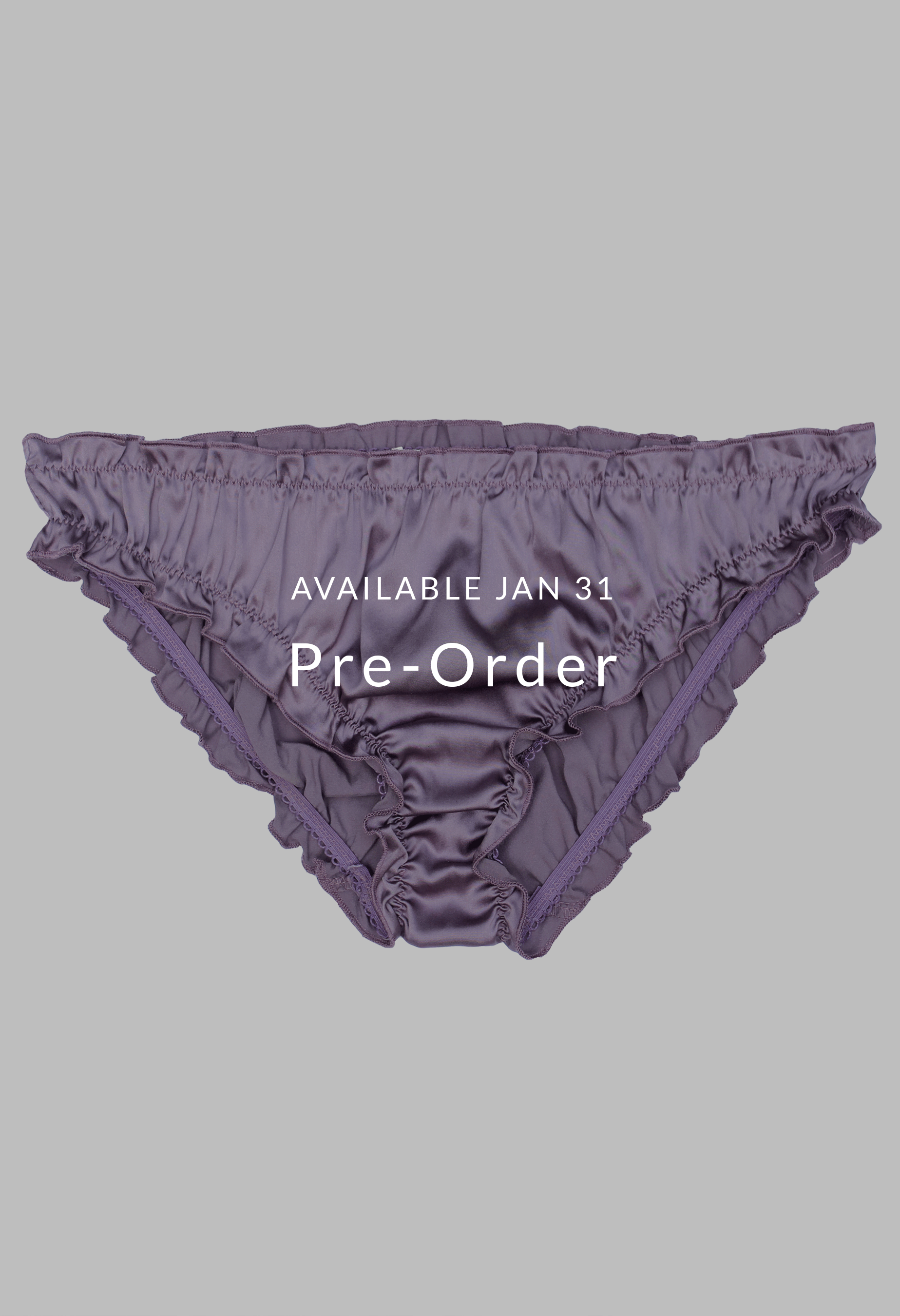 Lorette's best seller feminine bloomer panties crafted in a beautiful purple color. Delicately gathered with a soft, organic cotton elastic to offer comfort and ease. Can be worn high on the hips to elongate the legs or low-rise for more of a bloomer effect. Flattering for every body type, we can't get enough of the sweet ruffles.